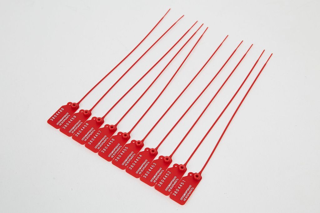 Пломба пласт. номерная, самофиксир., длина рабочей части 220 мм, красная 10/1000 купить оптом и в розницу в Нижнем Новгороде